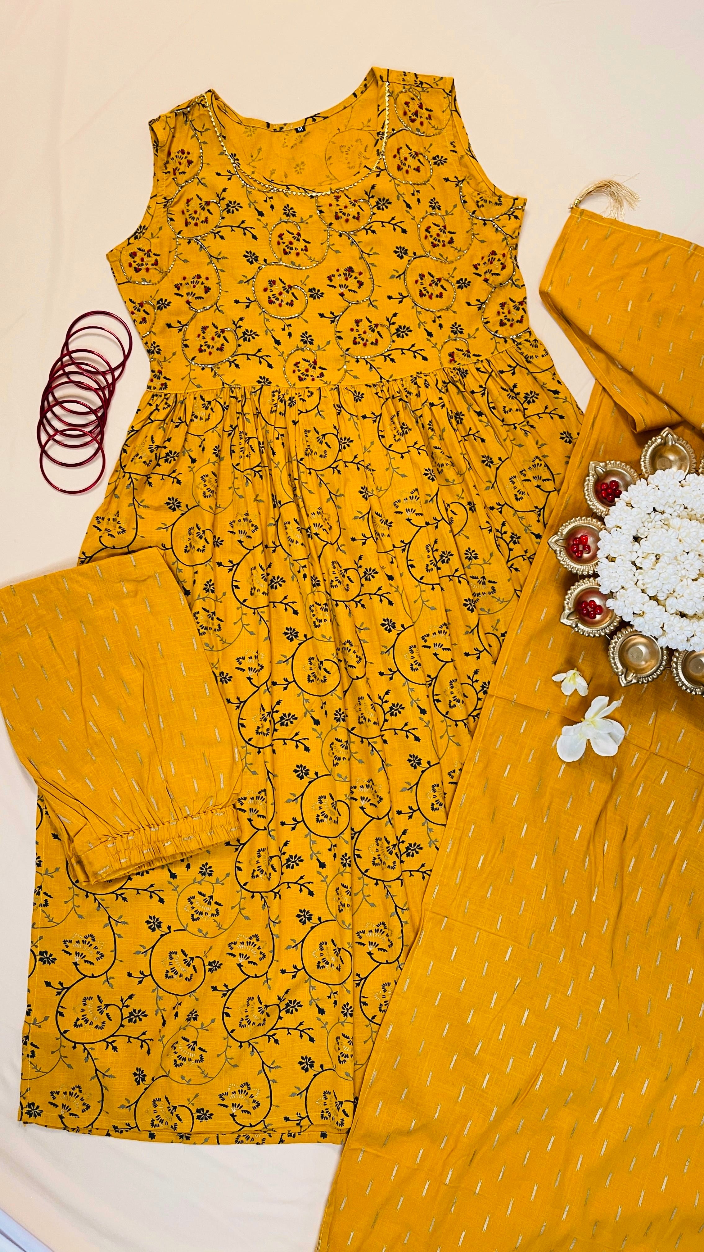 Yellow kurtha set with sequence work in cotton fabric. Suitable for wearing in festive season,Haldi function.