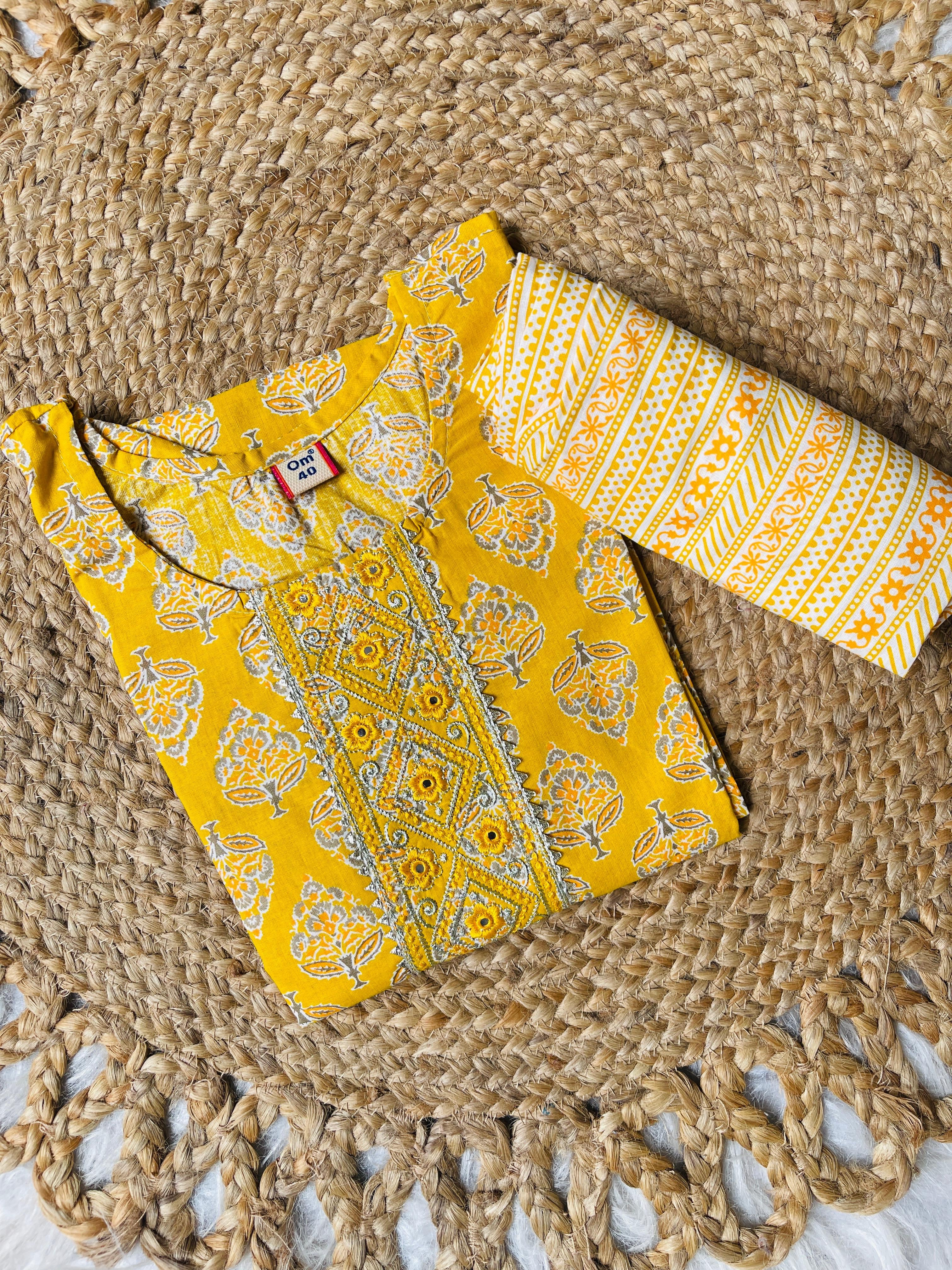 Traditional Indian ethnic wear (fusion/contemporary), highly characterized by its rich mustard color, intricate patterned embroidery, and the modern touch of mixed/contrast prints between the kurta and the bottom. Suitable for festive occasions, office wear, or stylish casual outings.