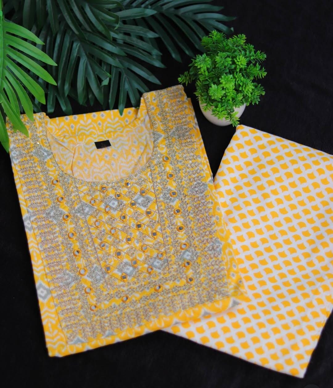 A bright 2-piece set featuring a Yellow Printed Kurta with a striking, heavily embroidered yoke. The yoke showcases Mirror Work and golden thread detailing. It is paired with White and Yellow Printed Trousers in a complementary geometric motif.